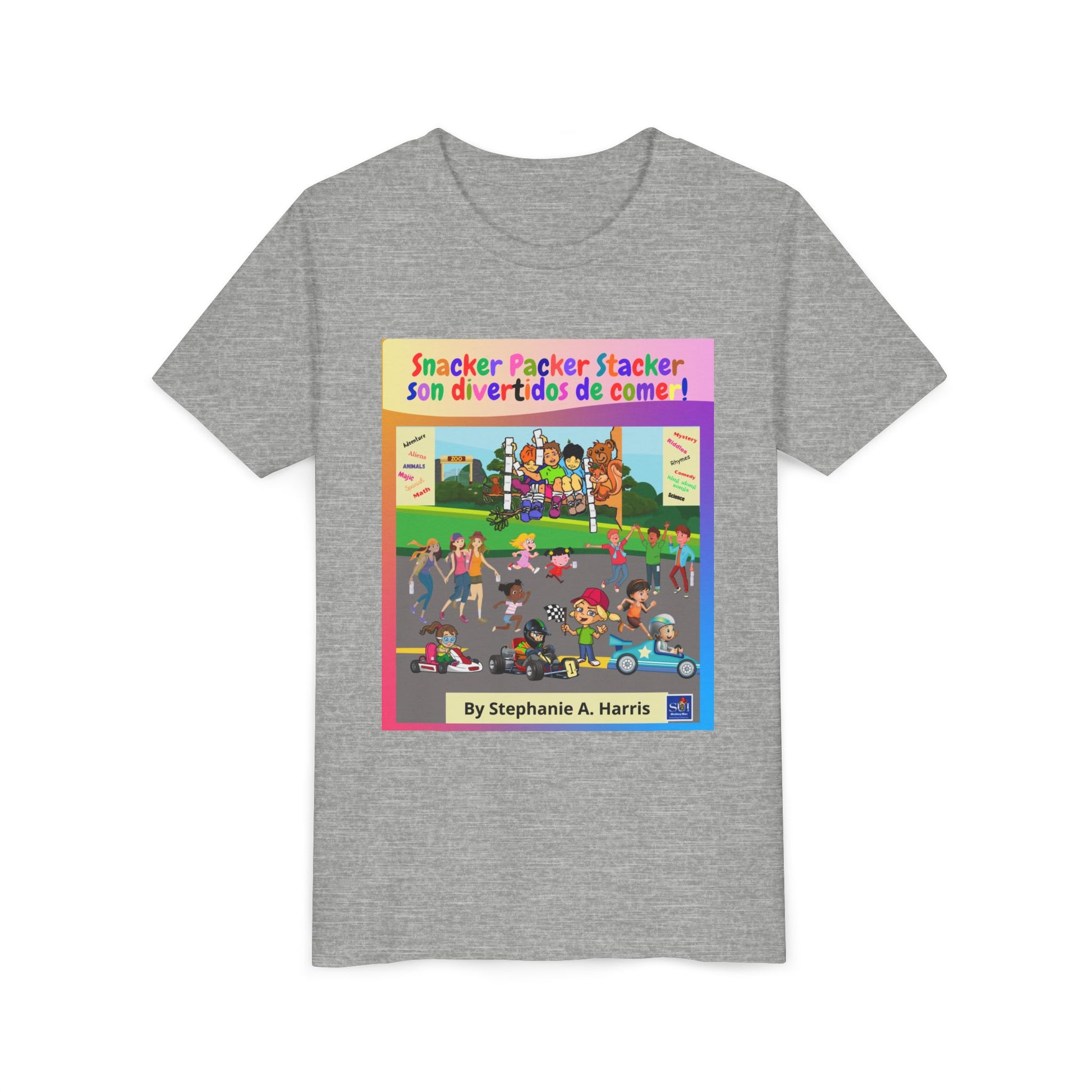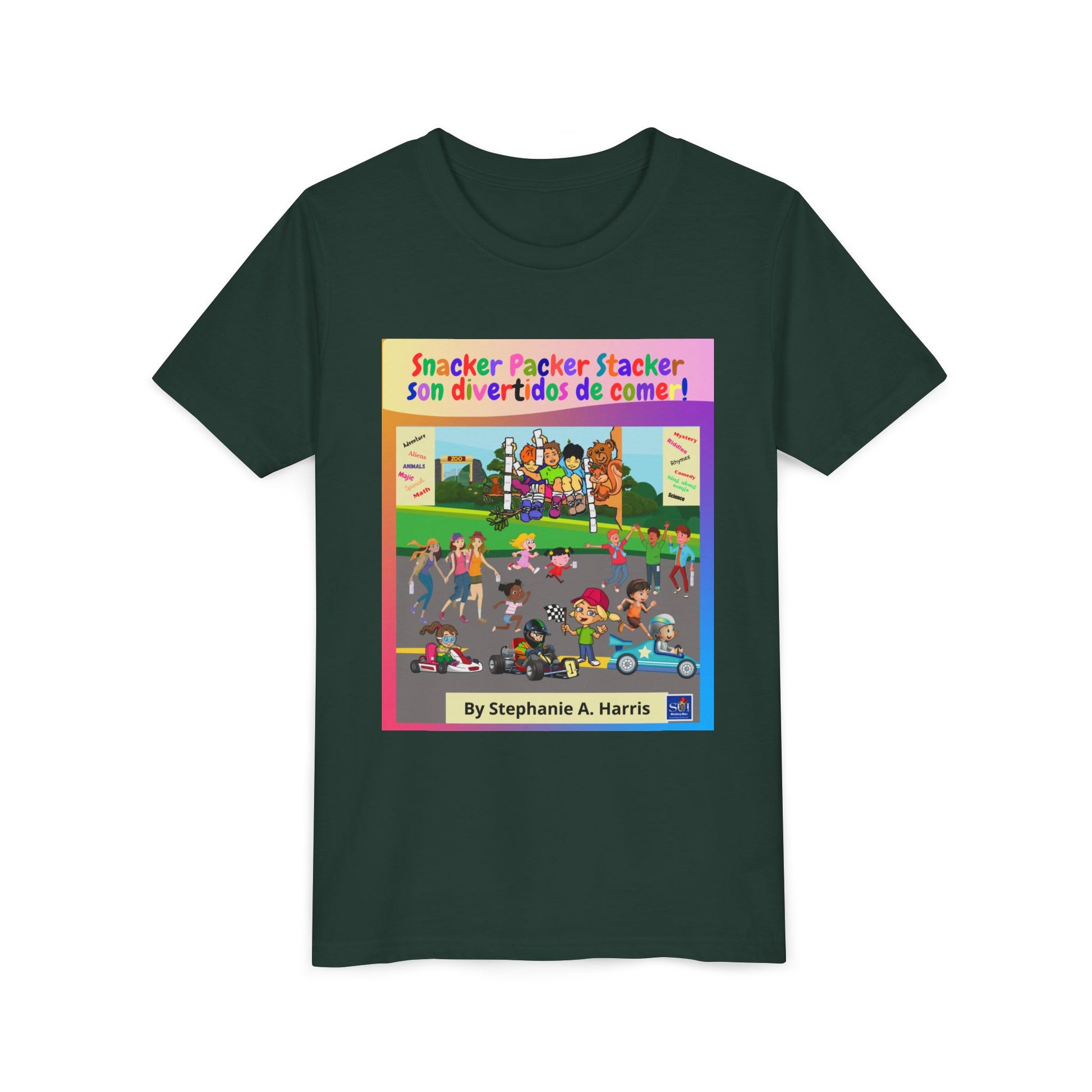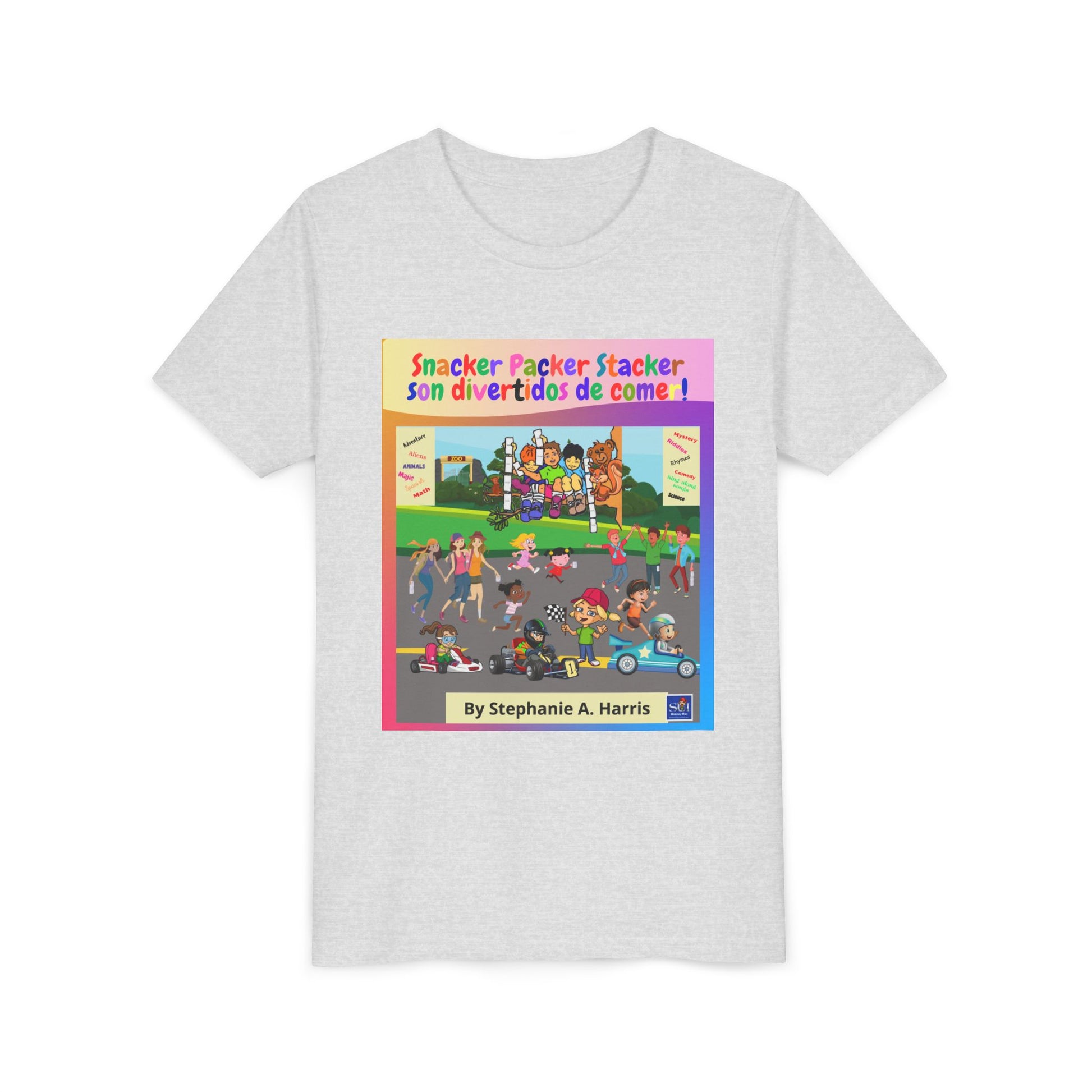 ¡Dale vida a la diversión del libro ilustrado con esta vibrante camiseta juvenil! Perfecta para jóvenes lectores que aman las aventuras de Mac el mono y sus amigos en Snacker Packer Stacker's Land.